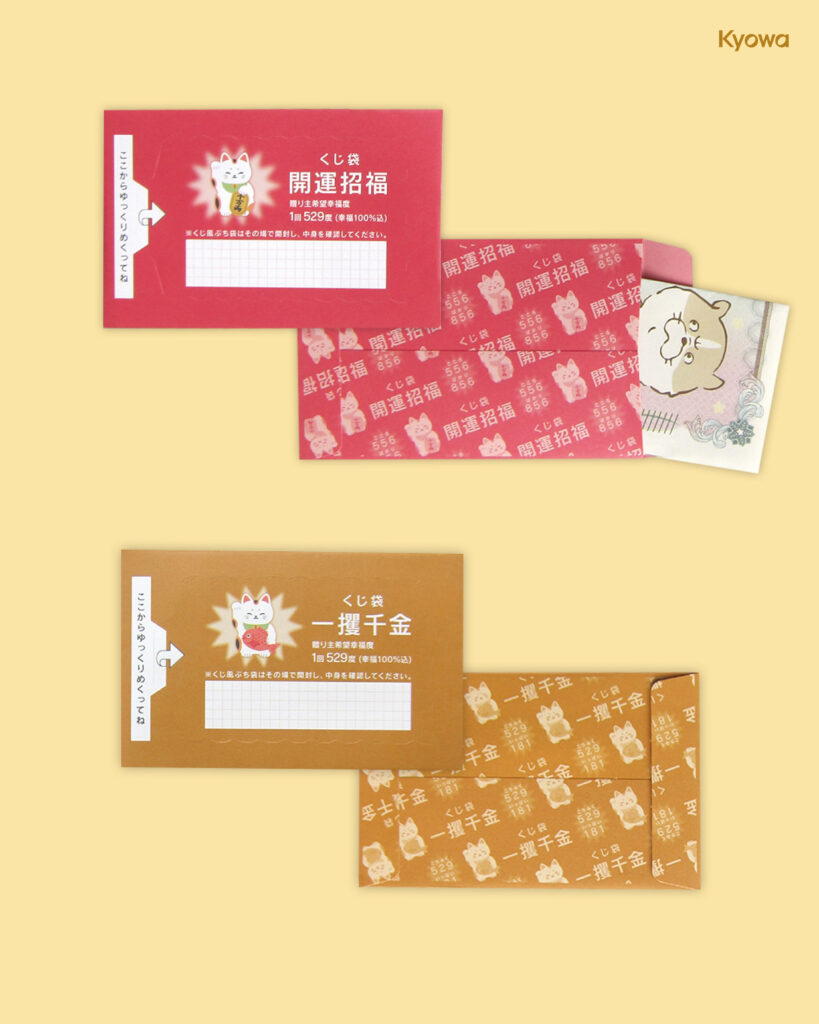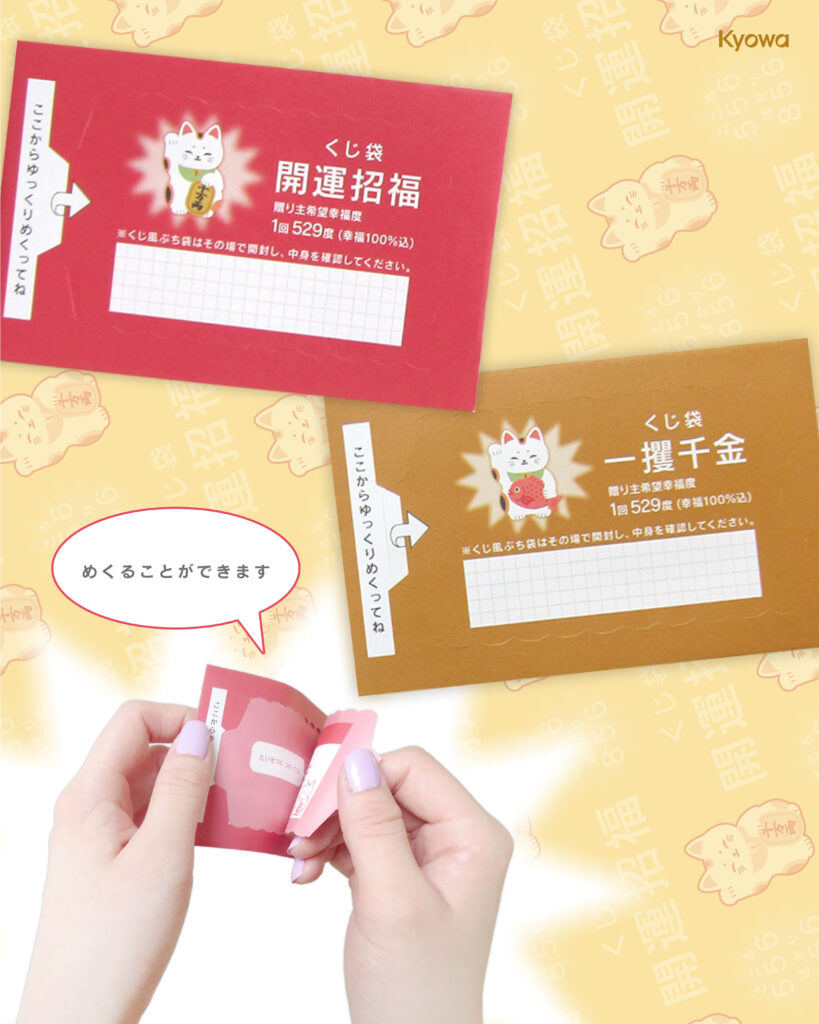 くじ風のぷち袋の発売です🎯封筒の前面に切れ込みが入っており、めくれるぷち袋になっています。ペリペリとした感触がクセになるかも💖めくった内側に運勢が書いているので、楽しんでくださいね✨