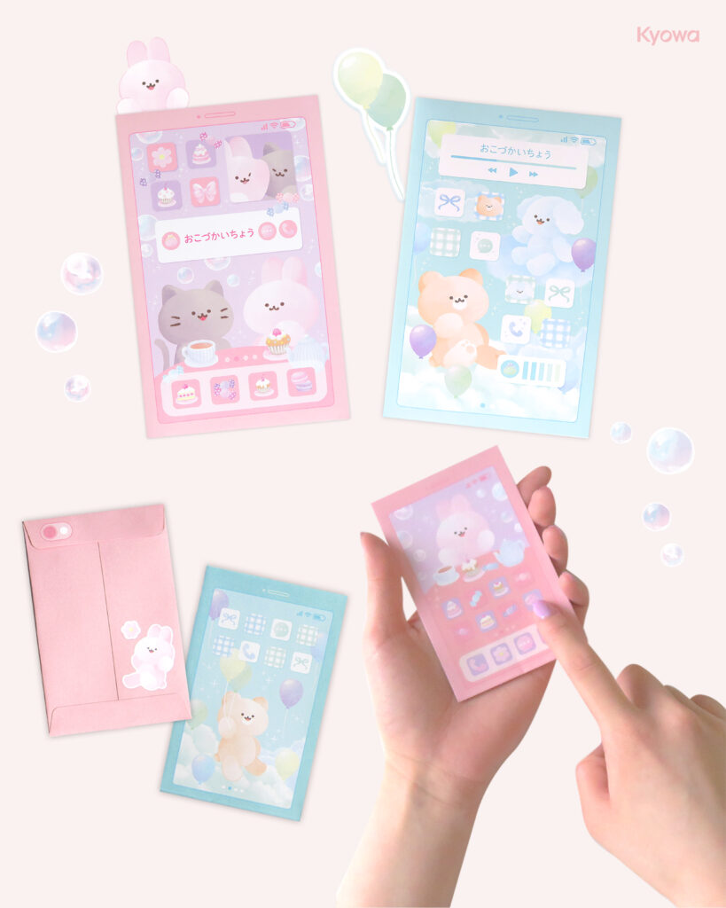 スマートフォンのような文具の登場です📱スマホ風のパロディデザインのおこづかいちょうとぷち袋。裏面にはちゃんとカメラのレンズのようなデザインがありますよ📸お好きなデザインをお選びください🍀