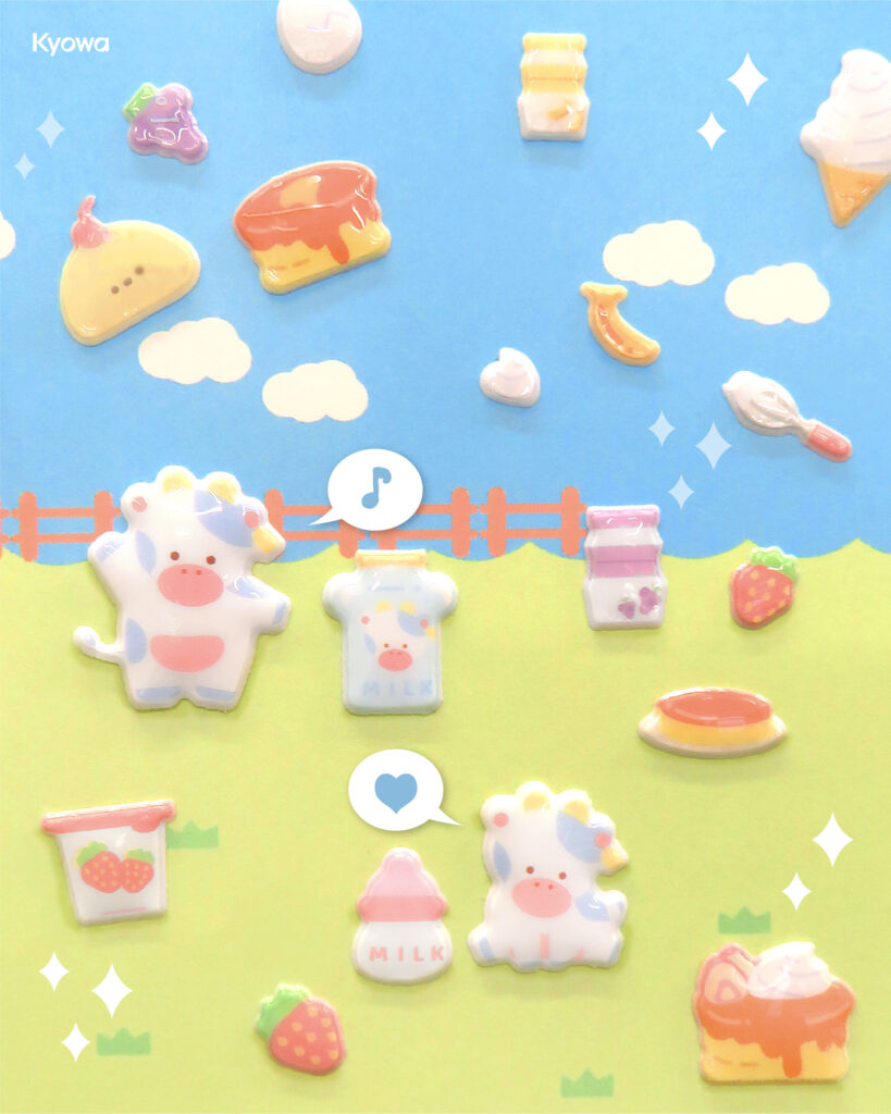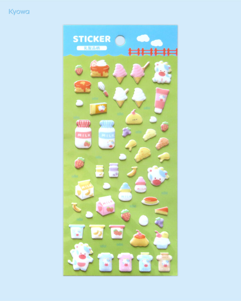 いろんな乳製品がデザインされたぷくぷくシールの登場です🧀ソフトクリームやアイス、ヨーグルトやプリンなど、乳製品を使ったデザートなどがぷくぷくシールになっています🍮ノートなどに貼って、牧場気分を味わってみるのはいかがでしょうか🥛🐄