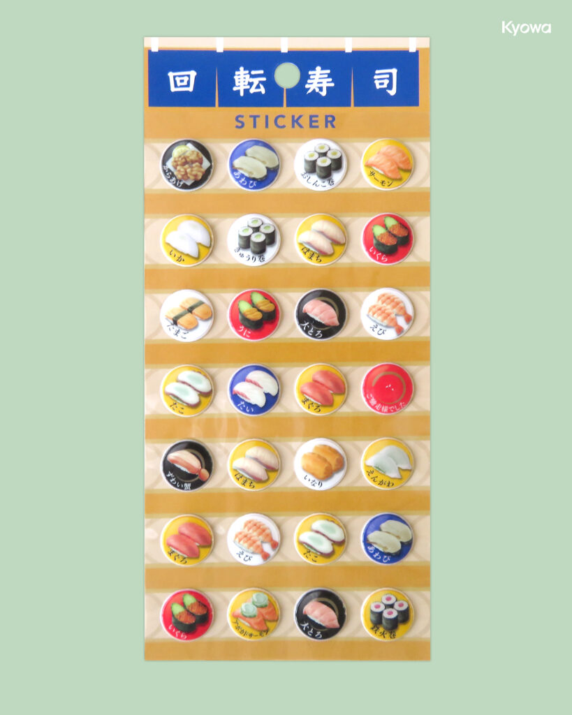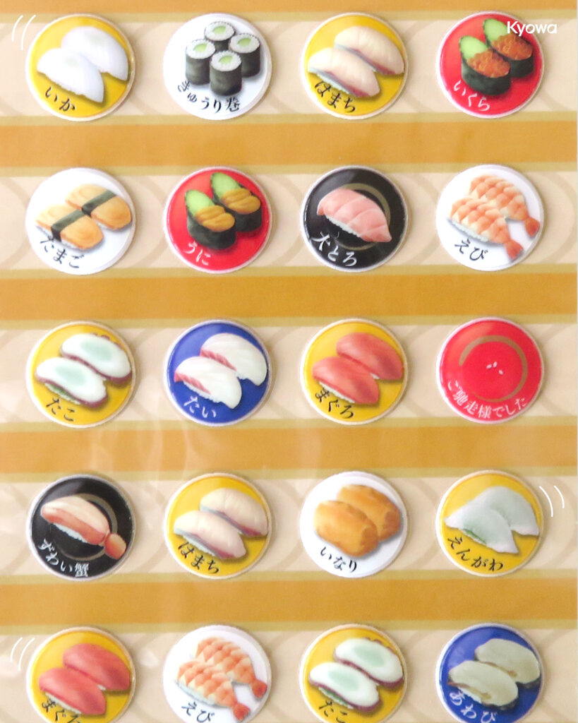 いろんなお寿司がぷくぷくシールになりました🍣✨まるで回転寿司のレーンのような台紙に、お皿の上に乗ったお寿司たちのぷっくりシールが並んでいます。お寿司の名前も書いてあるので、学習に使うのもいいかも…?