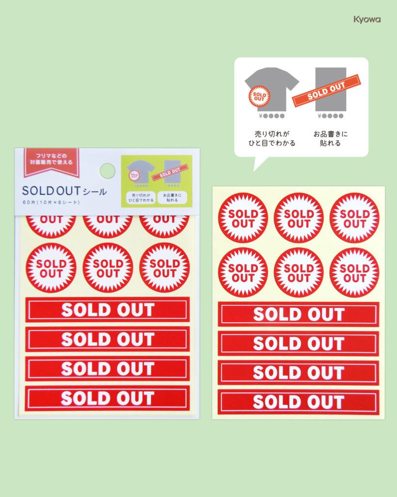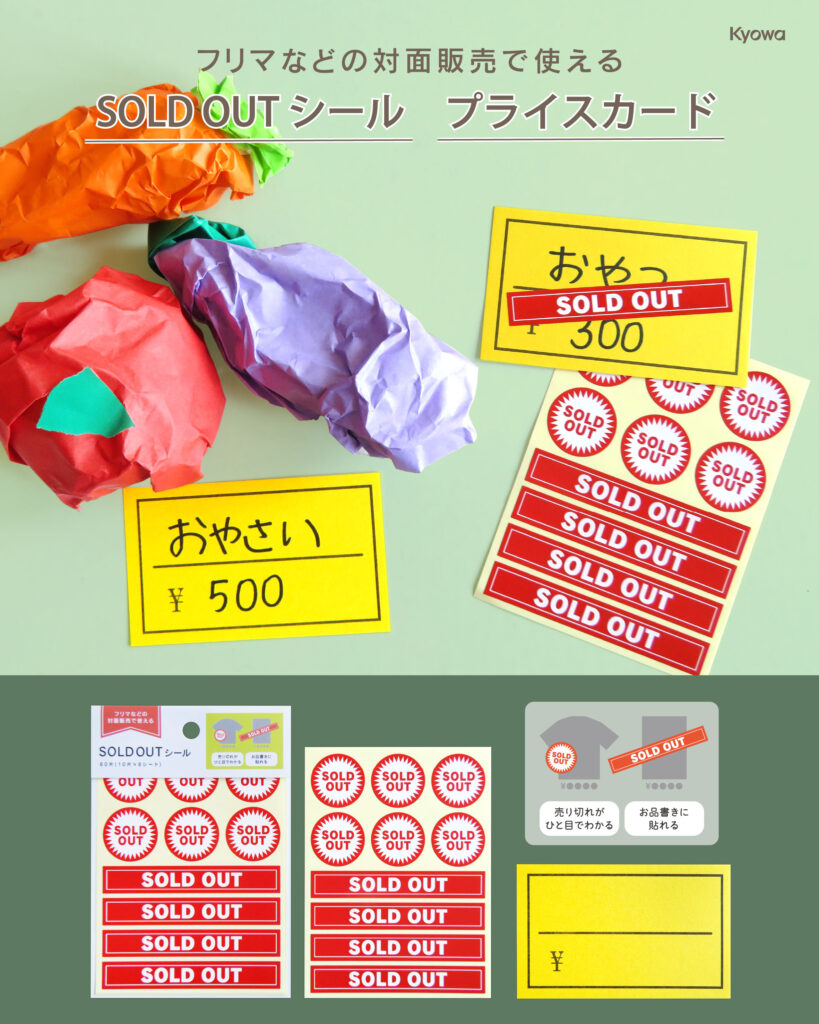 👛フリマなどの対面販売に便利なSOLD OUTシールとプライスカードのご紹介です👛お品書きや値札に貼って、売り切れが一目で分かる便利なSOLD OUTシールと、黄色のため値段が目立つプライスカードです。フリマなどへの出品や、お子様とのお店ごっこなど様々な場面でお役立てください☺